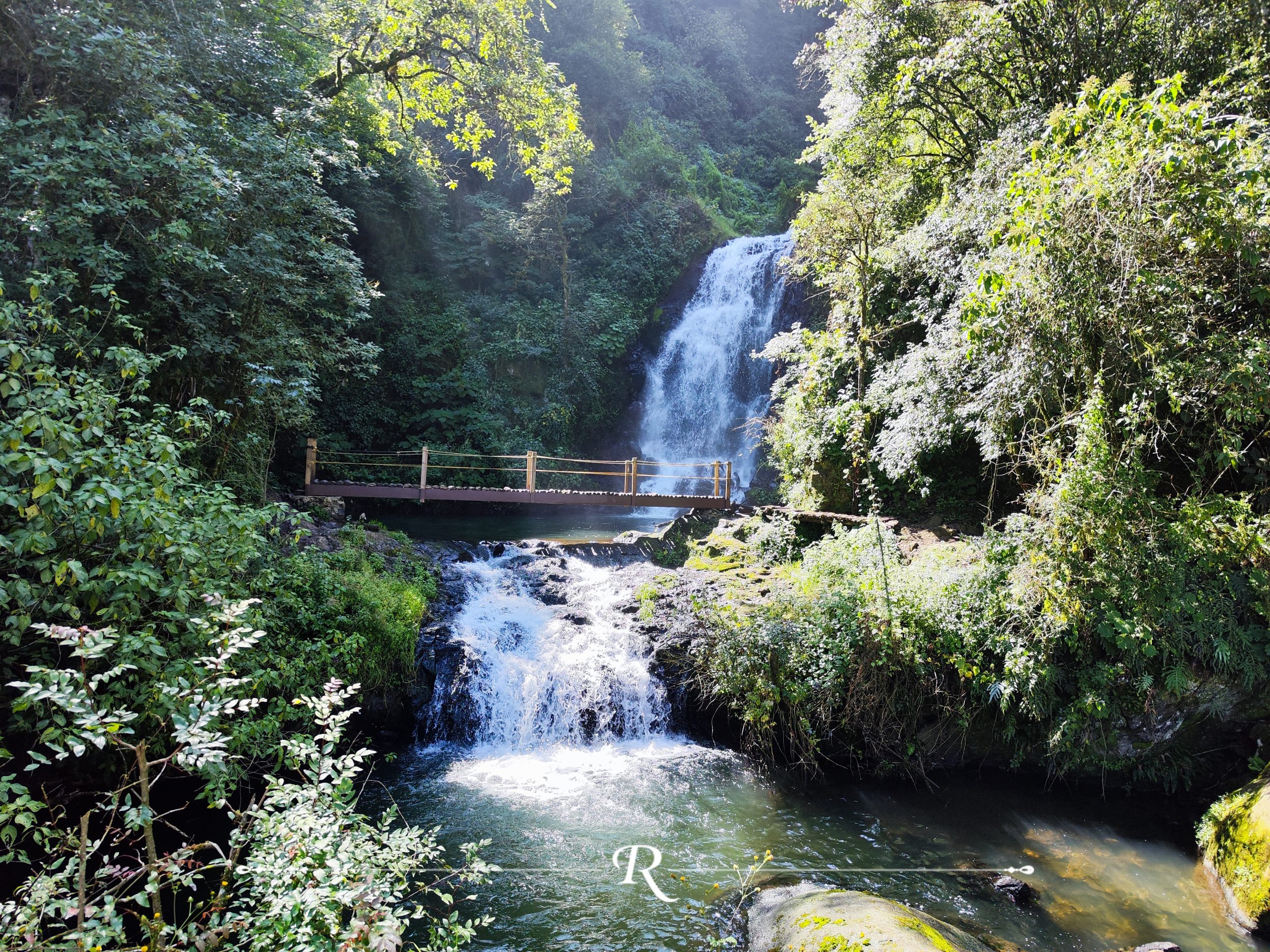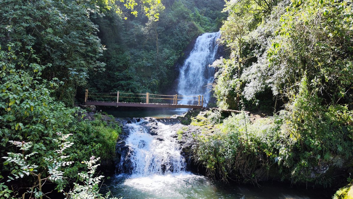 Cascadas Dos Mundos – Centro ecoturístico en la comunidad de San Fernando con cascadas, senderos y puentes colgantes en medio del bosque.